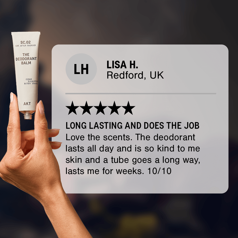 I was pretty sceptical about this product. How, (I wondered) could a paste with natural ingredients not only provide a lasting deodorising effect, but also protect my clothes from the curse of shop bought deodorant staining? I'm two weeks into my use and I've been bowled over by the performance of this ingenious product. The application of a pea sized amount under each arm works for a whole day. And I'm a big bloke who likes to sweat! I chose AFTER THUNDER as my debut fragrance and I've not been dissapointed. It has a lovely natural cedar wood smell that works brilliantly, the scent adapting as it soaked into your skin. The product feels comfortable to wear, is kind to my skin and makes me feel confident that I can get hot - but will not be smelly!. I also love the subscription option that's easy to manage. I could not recommend more highly. Thank you AKT.